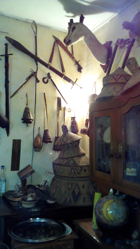 在阿斯马拉的最后一晚参加了一次十分纯正的本地聚会,饭后有幸目睹了这咖啡诞生地的喝咖啡仪式。众人围坐的屋内,先在中央地毯上摆放一个大香炉,点上龙涎香,然后身着民族服装的老年妇女端进一个炭火炉,将白色泛绿的生咖啡豆放入小炒勺,在炭火上烘培翻炒,瞬间,混合着龙涎香和咖啡味道的复合香气弥漫开来,令人飘飘然有微醺之感。然后老妇会端着盛放有熟咖啡豆的小炒勺绕场一周,给每一位宾客闻香。接下来就是研磨熬煮,装杯上桌。这样的咖啡其味道是三倍的Espresso也达不到的浓郁,按习俗要连喝三杯,席间可唱歌助兴。三杯如此浓郁的咖啡下肚后,高原上本就难以入睡,所以难免会兴奋一夜。