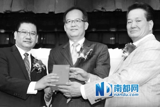 纽约台山宁阳会馆新主席黄仕初(左)从卸任主席倪楚勇手中接过印鉴(右)。