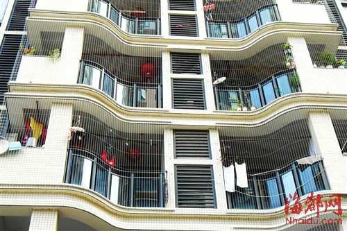 荔城南大道凤凰山附近一小区内,这里刚交房不久,从地面看上去,密密麻麻地装满了防盗网,且以隐形防盗网为主。业主郑先生说,装修时物业不让装不锈钢防盗网,要装只能装隐形防盗网。