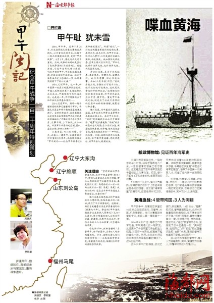 海都讯 甲午殇思、勿忘国耻,在甲午战争120周年纪念日之际,本报特别推出“甲午闽记——纪念甲午战争120周年特别策划”。连日来,特派记者从福州马尾出发,实地走访辽宁庄河黑岛、丹东大鹿岛、丹东东港市、大连旅顺口等地,寻访甲午遗址,翻阅地方卷宗,并陆续推出《经远舰管带林永升 成辽宁黑岛“守护神”》、《他们和邓世昌一样英勇》、《马尾造铁甲舰 差点扭转战局》等报道。