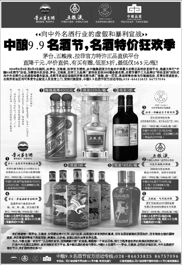 至9月9日期间,由茅台、五粮液、拉菲官方授权,由中酿集团倾力打造的中国最大名酒正品特价直供平台,将盛大举行“中酿9.9名酒节”活动。为赞助本次活动,茅台、五粮液、拉菲三大品牌厂家特价直供3995箱各款名酒。名酒节携手三大品牌以“特价直供”的形式向中外名酒行业的虚假和暴利宣战。名酒节承诺活动期间所售名酒为原厂珍酿,假一罚百;承诺销售价格为市场超低价,买贵双倍退差价。全国所有地区均可享受专业配送人员送货上门、货到付款服务。中酿9.9名酒节官方活动专线:028-8663382586757096