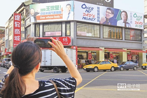 华夏经纬网8月9日讯:据台湾媒体报道,广告挂广告牌点燃台北市长选举战火!民进党议员王世坚日前挂“over my dad’s money”广告牌,讽刺国民党参选人连胜文的家世背景。连的前特助、国民党大安文山区议员参选人徐弘庭6日在同一处挂出“over whose body?”广告牌,拿王世坚和助理上汽车旅馆的旧事,强力反击。
