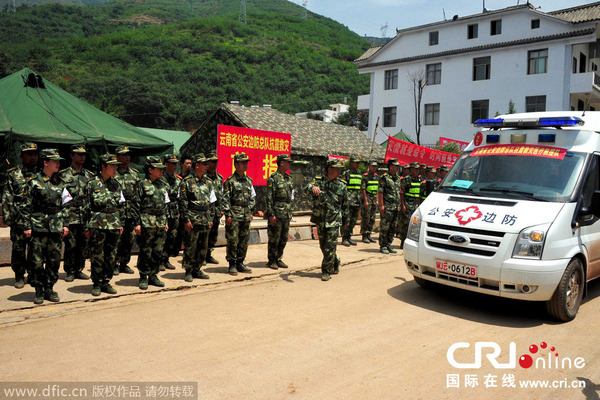 2014年8月8日,在经过4天4夜的连续打捞后,参加昭通鲁甸地震救援失踪的云南边防总队战士谢樵遗体被打捞上岸。中午装着谢樵遗体的车辆从龙头山镇缓缓驶过。与谢樵并肩战斗的战友们列队,接战友回家。许多灾区群众也自发赶来,送英雄上路。图为战友在临时指挥所前送别英雄。图片来源:东方IC