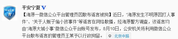 人民网北京8月11日电 据宁夏回族自治区公安厅官方微博消息,近日,“海原发生不明原因打人事件”、“关于人贩子偷小孩事件”等谣言在网络散播,经海原警方调查,该谣言均由“海原大城小事”微信公众平台账号发布,8月10日,公安机关将利用微信公众平台散布谣言的管理员王某予以行政拘留。