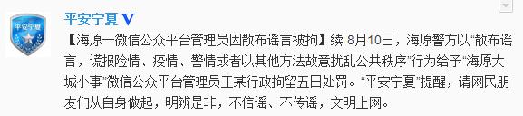 宁夏海原一微信公众平台管理员因散布谣言被拘