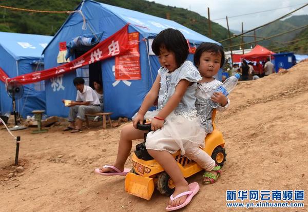 王镜阳(前)和她的小伙伴在龙头山镇的安置点坐玩具车玩耍(8月9日摄)。王镜阳,今年4岁,是云南省鲁甸县龙头山镇龙泉村的一名女童,今年刚上镇里的幼儿园小班。在8月3日发生的6.5级地震中,她的身体被震落的砖块卡住,被困了两个多小时才被亲戚和村民救出,所幸的是只有下巴被擦伤,腿部轻微伤。她的妈妈杨绍艳介绍说,家里一共有三名表亲遇难,多人受伤。在地震发生前,王镜阳是一名天真活泼的小女孩,十分爱笑。震后的头几天,王镜阳有些沉默寡言,受到一点点刺激就会哭闹。最近几天随着伤势渐好和心理专家的辅导,她的情绪有所好转,又重新开朗起来。随着救援物资的陆续抵达和救灾工作的深入,龙头山镇临时安置点的各项生活保障逐步落实,受灾群众的日常生活也逐步恢复。记者在王镜阳家住的帐篷里看到了方便面、矿泉水、家庭医药包、棉被和其他救灾物资,帐篷里也通了电。杨绍艳说,现在生活已经有了保障,她开始带王镜阳出门去玩,有时其他小朋友也会来找王镜阳。问到今后最大的愿望是什么,她露着小虎牙说:“我希望9月份能上中班(幼儿园),以后能到北京上大学。” 新华社记者 蔺以光 摄