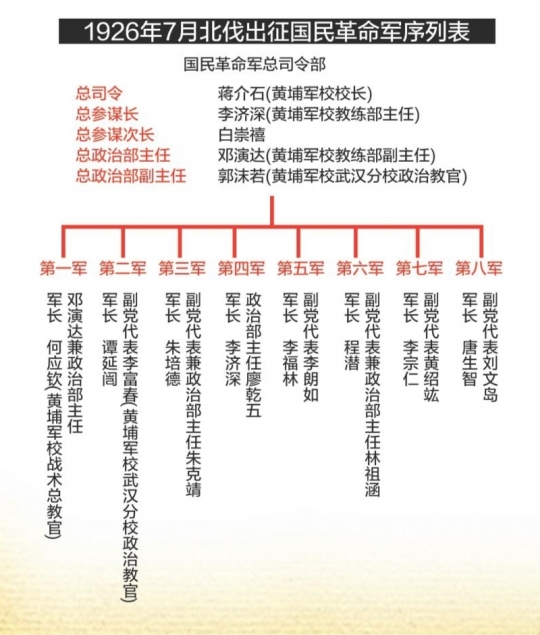 北伐部队分为八个军。第一军是由黄埔军校的几个教导团发展起来的。第四军独立团,即著名的叶挺独立团,将在日后的战斗中成名。