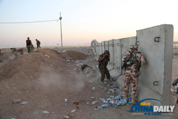 8月8日,在伊拉克北部城市埃尔比勒郊外的一个检查站附近,库尔德武装组织成员躲避在掩体后。 美国五角大楼8日说,美军当天已向“伊拉克和黎凡特伊斯兰国”极端组织在伊拉克北部的目标发动空袭。美国媒体报道说,空袭目标是该组织用于攻击伊北部城市埃尔比勒库尔德守军的火炮阵地。美军向火炮阵地投下两枚500磅的激光制导炸弹。(新华社/美联社图片)