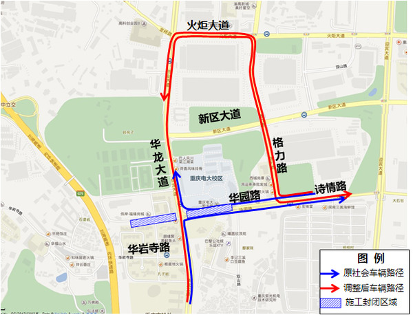 原经华龙大道、华园路往诗情路方向车辆改道:华龙大道—火炬大道—格力路—诗情路。