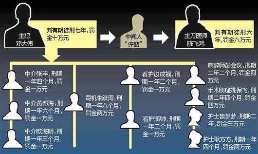 法院审理查明,现年35岁的荆州人邓大伟因赌博输钱,于2012年在网上搜索卖肾信息,后通过中间人“许喆”(另案处理)结识了陕西省人民医院肾移植科主治医师陈飞鸿,合谋给他人进行肾脏移植手术。邓大伟购买手术器械、药品,并租赁江夏区藏龙岛一处私房作为手术室,陈飞鸿担任主刀医师,邓大伟又邀约彭会议担任麻醉师,姚保飞担任助手,鲁梦梦、耿方方担任护士,张丰、黄邦海、欧海明通过互联网寻找“供体”和“受体”,朱跃周负责开车接送,边成福、潘帅对“供体”进行看护。