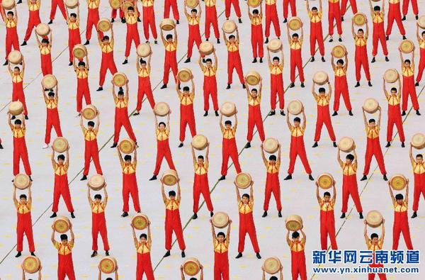 8月12日,曲靖师范学院学生在开幕式上表演《珠源鼓韵》。当日,云南省第十四届运动会在曲靖市文体公园体育场举行开幕式,来自曲靖市的大学生和各界群众以《逐梦珠江源》为主题,在开幕式上进行大型文体表演展示珠江源头曲靖市的风采。新华社记者杨宗友摄