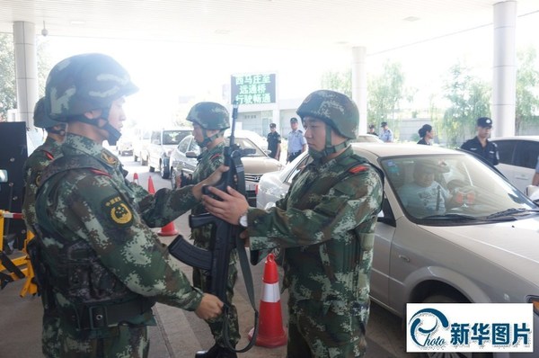 孙晶东介绍说,以往检查站由一名警察持枪警戒,一名警察和一名辅警盘查检查,现在则调整为武警武装警戒,多名警察及辅警同时盘查检查。在一些有条件的检查站,还增设安检通道及警察,增大作业面积提高进京车辆的抽检力度和通行效率。图为8月12日,北京市白庙检查站,武警持枪警戒。