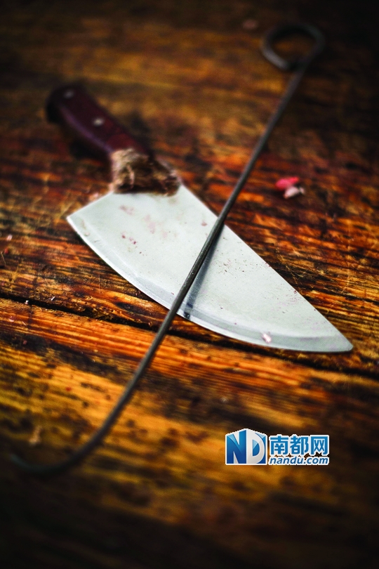 昨日,容桂上佳市市场,猪肉档上摆放着猪肉刀和铁钩。休市3天后,部分档口复市了。南都记者 郑俊彬 摄