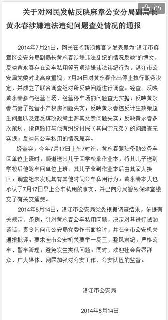 人民网北京8月15日电 近日有媒体报道称,广东省湛江市麻章公安分局副局长黄永春被举报存在公车私用等问题。举报人黄启发与黄永春同为遂溪县建新镇加埠村人,两家人同拜一座祖坟,是叔侄关系。湛江市公安局官方微博今日上午发布“关于对网民发帖反映麻章公安分局副局长黄永春涉嫌违法违纪问题查处情况的通报”。通报称,8月14日,湛江市公安局党委根据调查结果,依据有关规定、条例,针对黄永春公车私用问题,决定对其进行诫勉谈话,责令其向市公安局党委作书面检讨,并在全市公安机关通报批评。