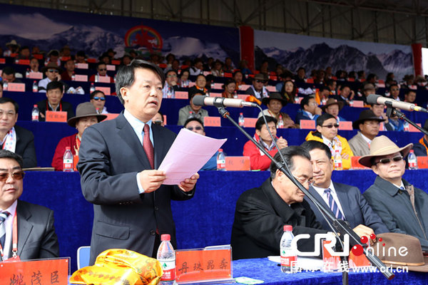 国际在线消息(记者 廖亮、高宇、陈维):青海省果洛藏族自治州建政六十周年庆祝大会暨第四届玛域格萨尔文化旅游节8月15日在果洛自治州玛沁县格桑滩草原隆重召开。各级领导、各界嘉宾以及该州将近5万名群众相聚一堂,共庆这一盛大的节日。