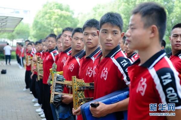 新华社照片,南京,2014年8月16日 (青奥观察)(36)“少林小子”演绎“青奥梦” 8月15日,河南少林塔沟武术学校学员在南京市金陵中学河西分校训练。备受瞩目的2014南京青奥会于8月16日隆重开幕。曾参与雅典奥运会、北京奥运会、广州亚运会等大型体育赛会开、闭幕式表演的河南少林塔沟武术学校,此次又派出了由988名学员组成的表演团队,参加本届青奥会开、闭幕式的演出。自7月1日进入南京表演场地排练以来,这些年龄在14至18岁的学员冒着酷暑,认真排练。尤其是在12至42米空中展示威亚特技的120名学员,除了克服恐高症外,还要在空中反复练习近百种造型动作,十分辛苦,最终圆满完成了各项表演任务。这些“少林小子”的表演被专家团队认为是开幕式上最大的亮点,给人们带来意想不到的惊喜和震撼。新华社记者陈益宸摄