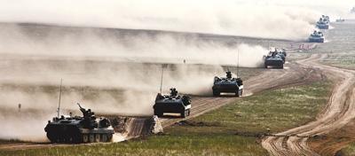 “跨越—2014”系列演习装甲兵集群向敌发起冲击。张坤平摄(人民视觉)
