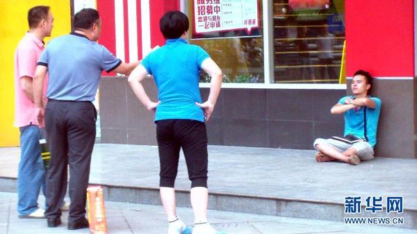 新华社照片,重庆,2014年8月20日 重庆石桥铺发生一起劫持人质事件 8月20日,重庆市九龙坡区石桥铺百脑汇数码广场门口发生一起持刀劫持人质事件,警方在进行劝说(视频截图)。当日18时许,重庆市九龙坡区石桥铺百脑汇数码广场门口发生一起持刀劫持人质事件,一名男子持刀劫持一名男性人质,武警重庆市总队一支队巡逻中队第一时间达到现场,实现警戒封控,并与重庆公安对其实施攻心劝降,19时10分左右,该男子将人质释放。目前,石桥铺现场已恢复正常秩序。据悉,该持刀男子因家庭矛盾导致妻子带小孩离家数日不归,故采取劫持人质的极端方式希望引起注意求妻儿回家。新华社发(黄伟 摄)