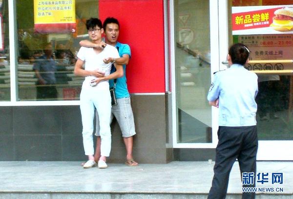 新华社照片,重庆,2014年8月20日 重庆石桥铺发生一起劫持人质事件 8月20日,重庆市九龙坡区石桥铺百脑汇数码广场门口发生一起持刀劫持人质事件,警方在进行劝降(视频截图)。当日18时许,重庆市九龙坡区石桥铺百脑汇数码广场门口发生一起持刀劫持人质事件,一名男子持刀劫持一名男性人质,武警重庆市总队一支队巡逻中队第一时间达到现场,实现警戒封控,并与重庆公安对其实施攻心劝降,19时10分左右,该男子将人质释放。目前,石桥铺现场已恢复正常秩序。据悉,该持刀男子因家庭矛盾导致妻子带小孩离家数日不归,故采取劫持人质的极端方式希望引起注意求妻儿回家。新华社发(黄伟 摄)