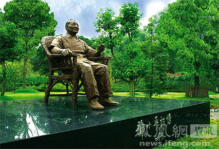 广安市广安区协兴镇牌坊村三面青山环抱的邓小平故里,着短袖衬衫、军便裤、圆口布鞋,邓小平面带微笑地坐在藤椅上,从2.5米高处俯视所有对他的纪念。