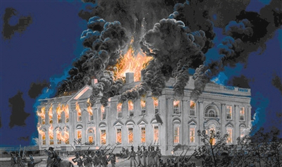 1814年8月24日,美国总统官邸“白宫”被英军纵火焚烧;次日,大火后的白宫只剩下墙壁,内室全毁。