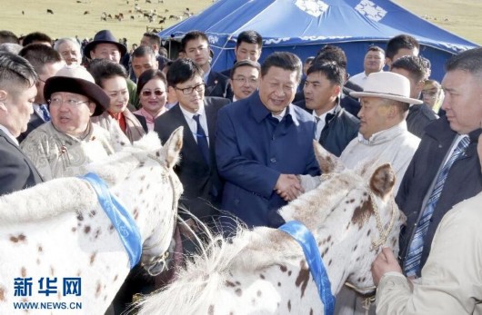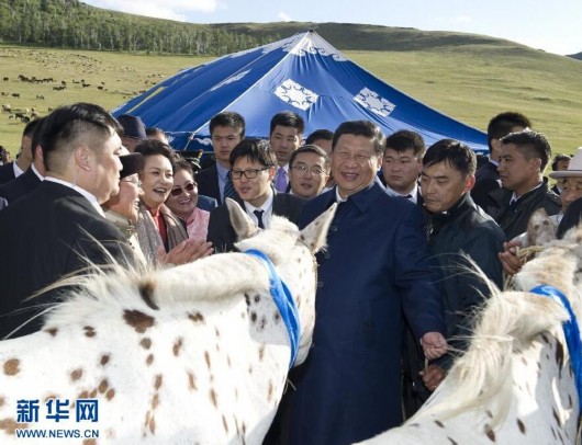 8月22日,国家主席习近平在蒙古国总统额勒贝格道尔吉陪同下前往乌兰巴托市郊观看那达慕。额勒贝格道尔吉向习近平夫妇赠送两匹蒙古马。习近平为两匹马分别取名阿尔泰和克鲁伦,寓意中蒙两国山水相连、睦邻友好。黄敬文 摄 图片来源:新华网
