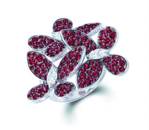 此款圆形红宝石和马眼形钻石戒指,以马眼形和梨形切割的璀璨美钻化作栩栩如生的蝴蝶身段,曼舞于精致的钻饰之间,既是时尚女强人的最佳配饰,也是出席婚礼的首选,更为婉约迷人的新娘添上最幸福的光环。钻石共重1.87克拉,红宝石共重3.89克拉。