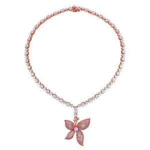 ARTē往往以跨界合作体现优雅浪漫,2014年再度率先推出Mariposas蝴蝶系列。Mariposas蝴蝶项链以75颗大小相间的白色圆形晶钻环绕而成,末端以垂坠飞舞的蝴蝶作结,灵动有致。蝴蝶以一颗重0.75克拉的浅粉红色水滴形晶钻作主体,171颗白色及深粉红色晶钻镶嵌在轻盈灵逸的翅膀底座上,光芒徐徐洒落,闪耀无边。