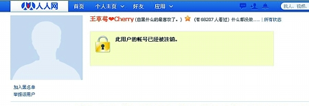 “王草莓”的人人网账号已被注销(网页截屏图)