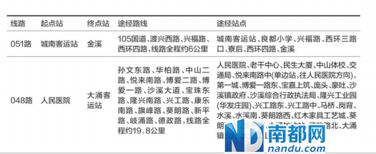 南都讯记者肖成 为方便南区渡兴西路、兴福路的居民公交出行,中山公交集团定于8月28日起开通公共汽车051路线“城南客运站-金溪”。也是从明天起,048路线“市交通局-大涌镇政府”调整为“人民医院-大涌客运站”,公交服务咨询电话:87330663,查询网址:www.zsbus.cn,w ap.zsbus.cn。请广大乘客留意。![]()