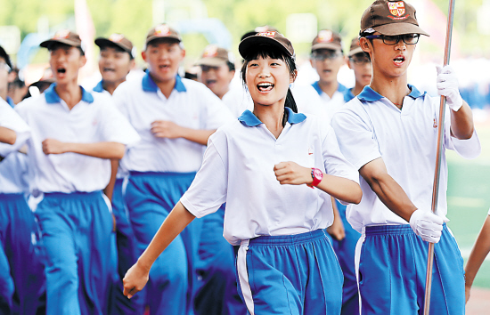 广州的学生这些天也正顶着烈日接受军训的考验。图为广大附中的学生近日进行军训汇演