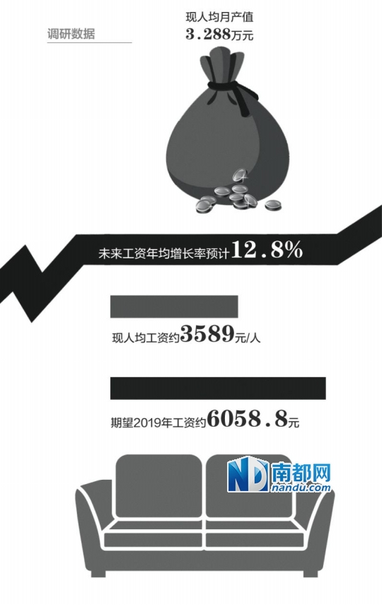 最后,叶中平组成的调研团队得出了这样的数据:样本家具企业人均月产值为3.288万元;家具企业人均工资约为3589元/人,未来工资年均增长率预计为12.8%,预计到2019年,样本家具企业每月期望工资约为6058.8元。