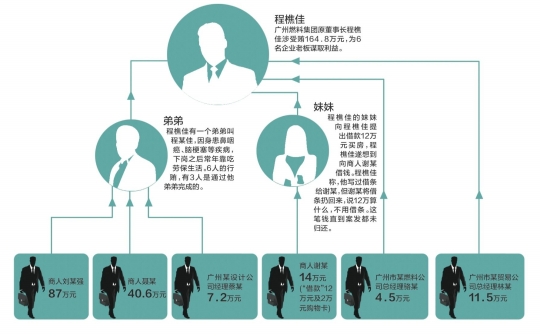 比如在2005年至2011年间,程樵佳涉嫌利用职务便利在公司物业租赁和煤炭购销贸易上,为一名叫刘某强的商人打招呼,并先后通过弟弟程某佳收受了刘某强的贿赂款共计87万元。几乎以同样的方式,程樵佳还涉嫌收受了商人聂某贿送的40 .6万元;以及广州某设计公司经理蔡某贿送的7.2万元。
