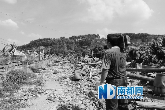8月26日,在博罗县福田镇鸡公坑村尖峰山山塘周边,刚被镇政府清拆过的养猪场残垣断壁,盛潲水油的蓝色塑料桶横七竖八躺在地上,随处可见砖头块与横梁木。
