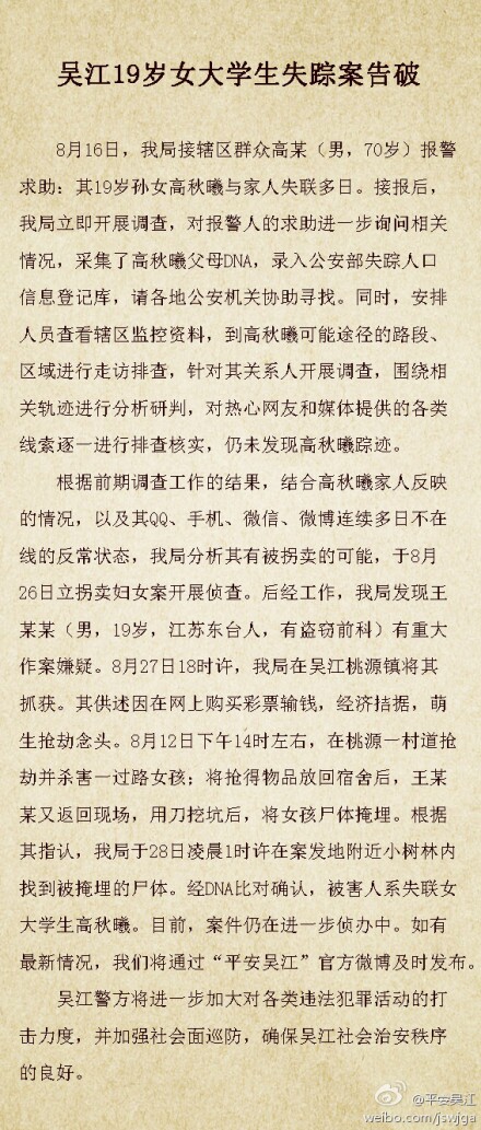 原标题:吴江警方召开新闻发布会:宣布19岁女大学生失踪案告破