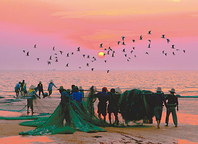 暮色降临,夕阳淡淡的余晖,洒在波光粼粼的海面上,让人不禁想起“半江瑟瑟半江红”的诗句。跟随渔民的步伐,登上一叶扁舟,徜徉大海,寂静幽深的海水无声流淌。远处丹霞如画,近处村庄如歌。