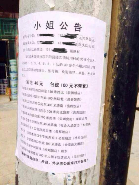 河南宁陵县街头现“小姐公告”