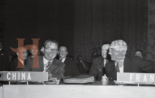 1955年,联合国代表大会上,中国代表蒋廷黻(左)与法国代表赫夫·阿尔方德交谈,这次大会上,蒙古申请加入联合国,蒋介石坚决投出了反对票(资料图)