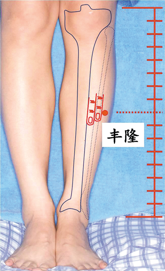 丰隆穴在小腿前外侧,外踝尖上8寸(膝眼与外踝尖间的中点),距胫骨前缘两横指(见右图)。