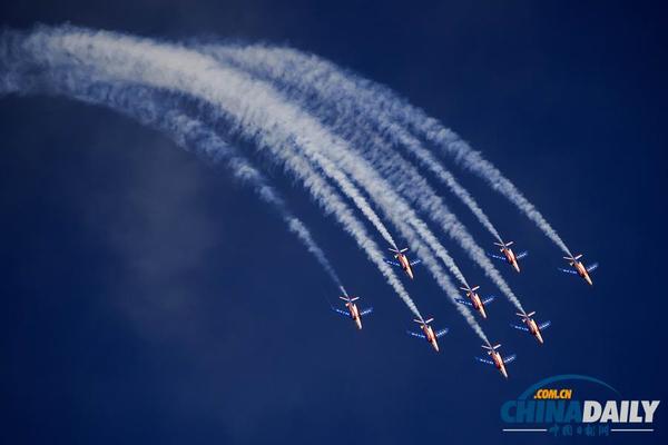 8月30日,在瑞士帕耶讷的机场,法国空军“法兰西巡逻兵”飞行表演队的喷气式飞机进行表演。 当天,瑞士举行今年欧洲最大规模的飞行表演,庆祝其空军建军100周年。 新华社/法新
