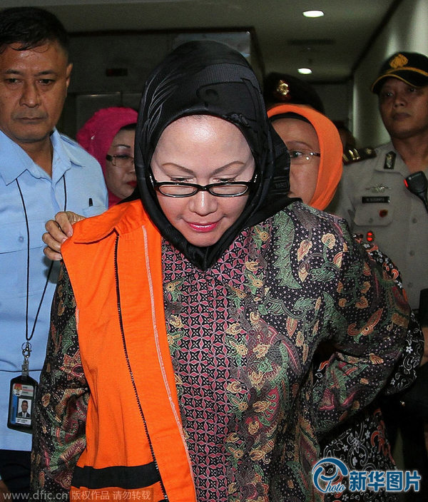 当地时间2014年9月1日,印尼雅加达,Ratu Atut Chosiyah出席庭审。Ratu Atut Chosiyah是印尼首位女性省级领导人,也是印尼最有权利的家族政治领导人之一。她因在选举纠纷中贿赂法官被判4年监禁。