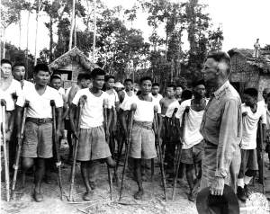 1944年7月15日在沿中印公路某处的康复营地里,史迪威将军脱帽对着一群中国退伍军人讲话■资料图片