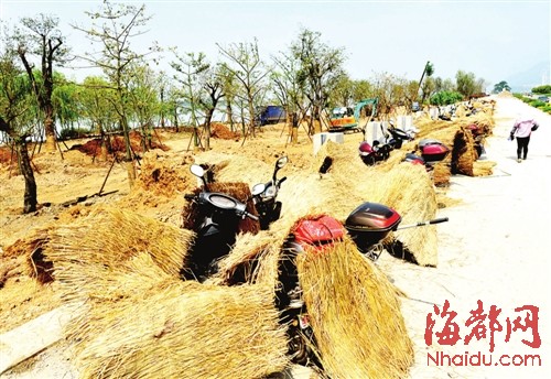 随后,记者询问了现场的一位工人。工人表示,这些电动车都是他们骑来的。他们要顶着烈日在太阳下工作一整天,电动车也要晒一整天。等他们回家时,电动车坐垫会发烫,根本无法坐上去。所以,他们用稻草盖在上面,就像给电动车穿上了一件衣服,就不怕晒了。