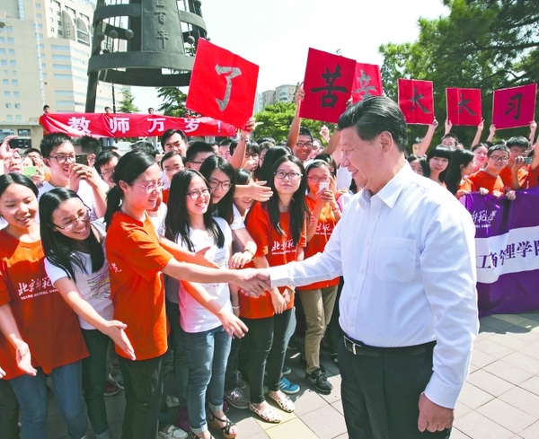 昨日,习近平离开北师大时,同闻讯赶来的师生热情握手 新华社发