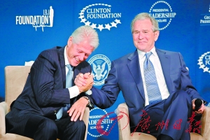 原标题:克林顿小布什同现身“打情骂俏”妙语连珠