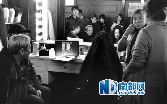 8姐翻了翻微博,发现2014年7月23日,电影《白发魔女传之明日天国》官方微博公布的白发魔女造型设计花絮照中,有一张图的镜子里出现了疑似李彦墨的头像(见圈圈),而这张照片显示:叶锦添、张之亮等剧组人员正在给范冰冰试造型。可见李妈妈所说非假。