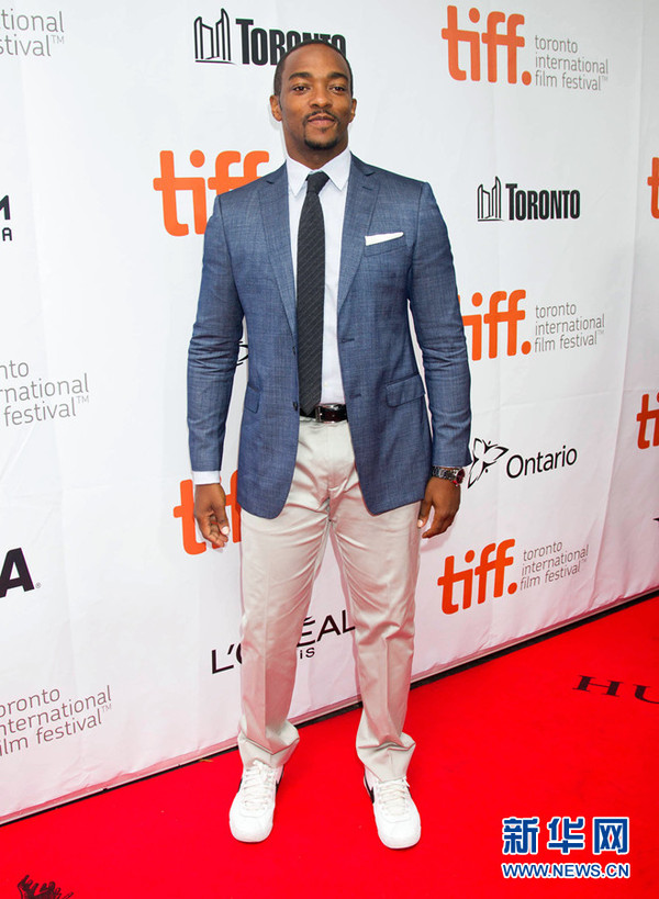 《美国队长2》里出演老兵的安东尼·麦凯(Anthony Mackie)出席影片《黑与白》全球首映红毯式。新华网记者 邹峥 摄