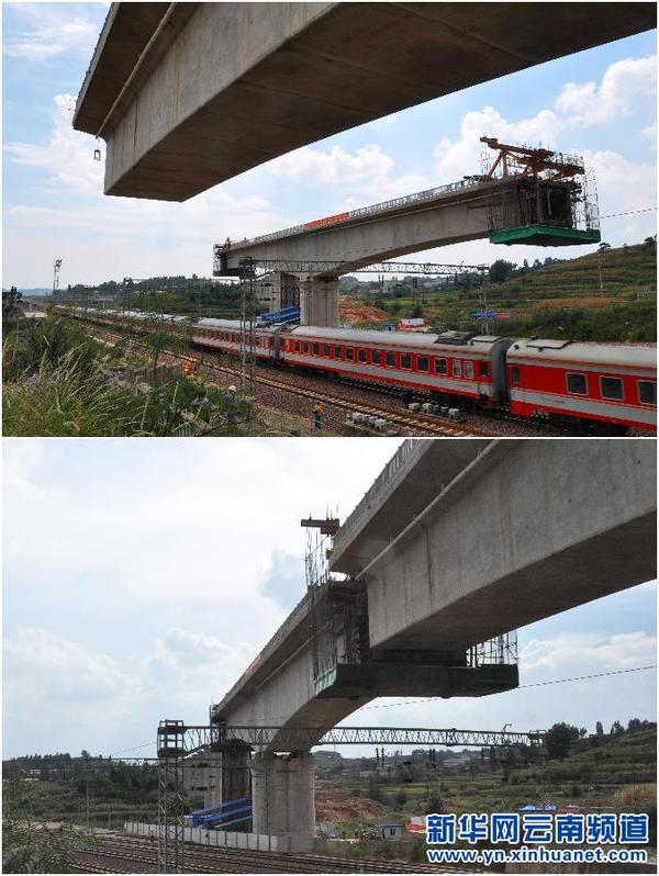 9月10日,沾益特大桥在空中对接。 9月10日下午,经过1个小时的缓慢转动,矗立在沪昆铁路沾益火车站两侧、重达8300吨的两段“巨无霸”桥梁,向跨越的沾益火车站平转25.3°,实现桥梁精确合龙。沾益特大桥是沪昆高铁云南段的控制性工程。新华社记者 潘洁 摄