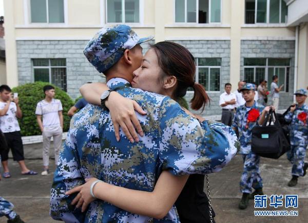 9月5日,在广西柳城县人民武装部,一名入伍新兵临行前与亲人深情相拥。自当日起,全国各地新兵陆续启程奔赴军营,开始他们的军旅生涯。 新华社发(邓克轶 摄)