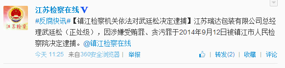 人民网北京9月12日电 据江苏省人民检察院官方微博“江苏检察在线”消息,江苏瑞达包装有限公司总经理武廷松(正处级),因涉嫌受贿罪、贪污罪于2014年9月12日被镇江市人民检察院决定逮捕。
